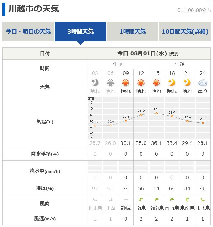 全体を見ると、川越市の天気はお昼をピークとした36度ですが、体感温度は40度以上になるでしょう。