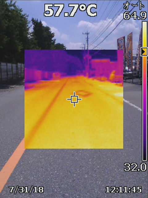 正面のアスファルト道路を測定しましたら、57,7度です。