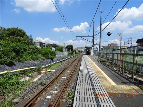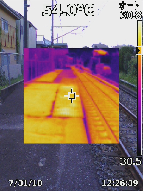 電車を待っている時間は、日陰がないので注意。特に観戦後に帰る場合でも、この程度の温度になっている可能性があり、熱射病対策は必要になります。