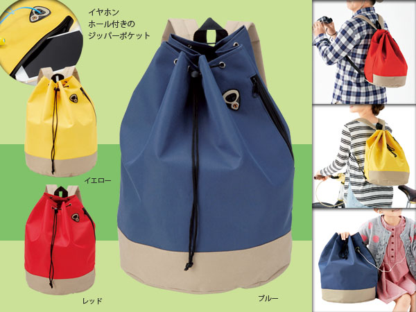 巾着のようなバッグでリュックにもなる肩掛けベルトもついています。シンプルな構造なのでいろいろなものを詰め込みやすく、普段使いやレッスンバッグとしてはもちろんですが防災バッグなどでも使うことができます。ちょっとワイルドなイメージもあるのでアウトドアや感じなシーンでも似合うので、貰って嬉しいリュックのスタイルでもあります。40代の世代では「ジョーのバッグ」とか言われていたタイプのバッグに似ています。