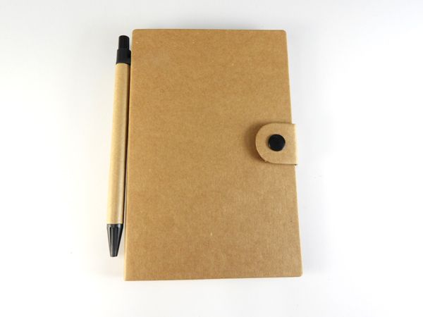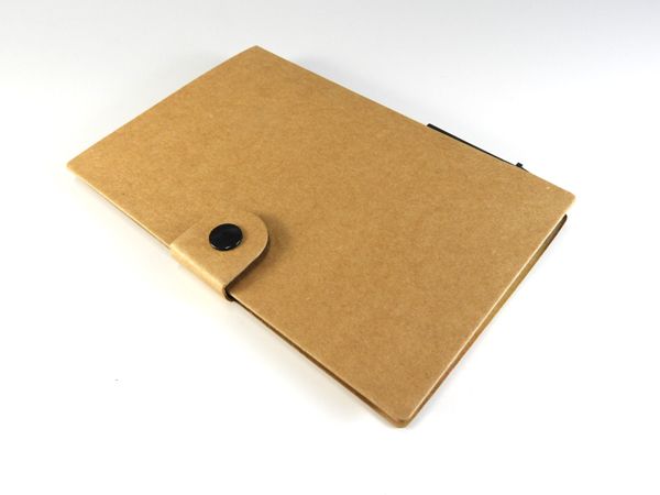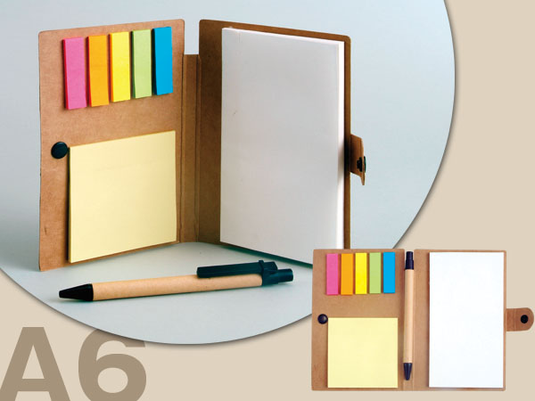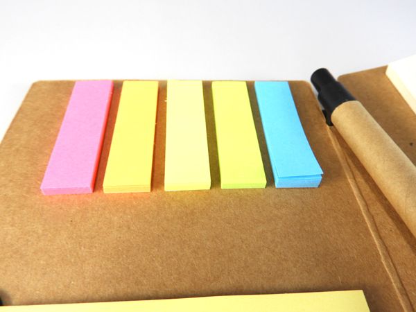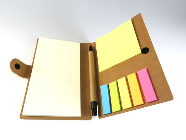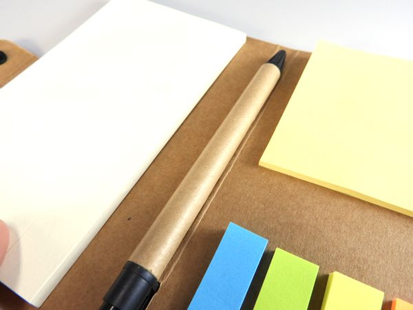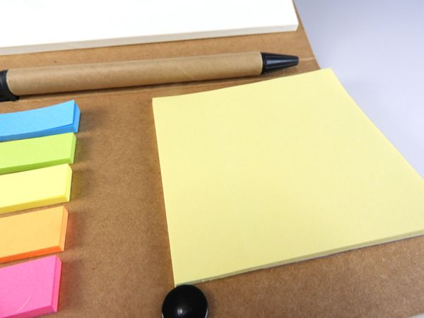 クラフト用紙をベースにした素朴な味わいのカバーにメモ用紙と通常タイプと大きいタイプの2種類の付箋がセットになった