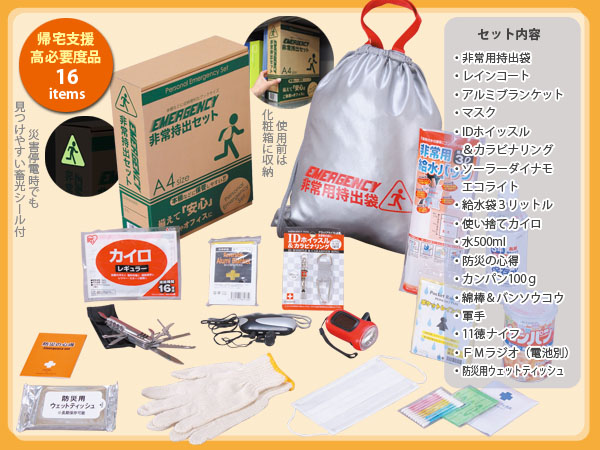 | 備考 | 非常用持出袋・レインコート・アルミブランケット・マスク・IDホイッスル&カラビナリング・給水袋3リットル・ソーラーダイナモエコライト・使い捨てカイロ・水500ml・防災の心得・カンパン100g・綿棒&バンソウコウ・軍手・11徳ナイフ・防災用ウェットティッシュ・FMラジオ(電池:単四×2本・別売)