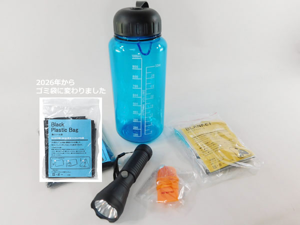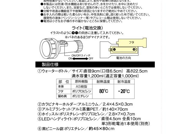 ウォーターボトル×1・カラビナキーホルダー×1・アルミブランケット×1・ホイッスル×1・LEDハンディライト×1・黒ビニール袋×1 単3形乾電池1本使用(別売) |