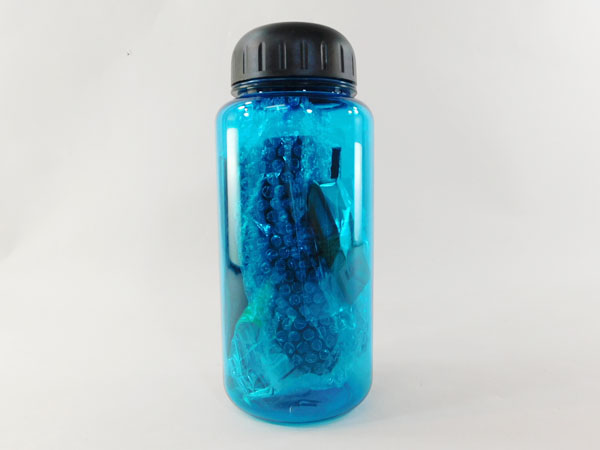 水色のボトルの中に防災グッズ6点が入った小さな防災セット。