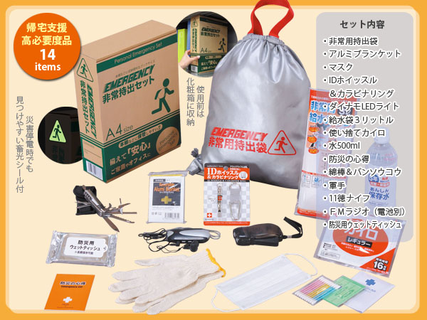 14点の非常用グッズが入っている中サイズのセットで、急な災害時にも対応できる非常用持出セットです。帰宅支援も意識しているので会社に常備しておくのにも適しています。