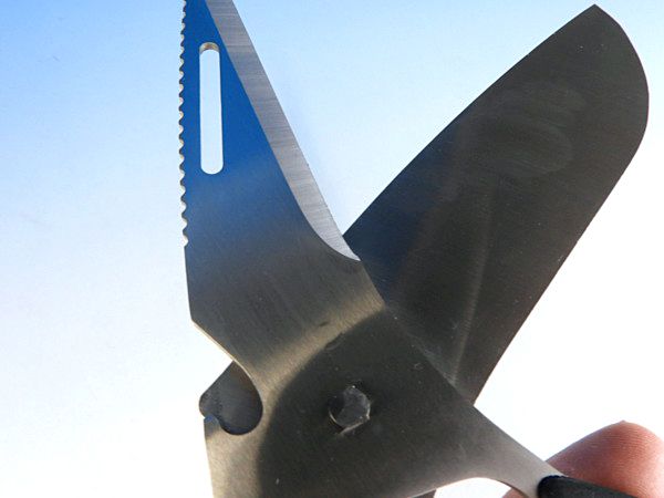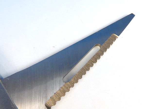 パッと見た時にすぐにわかる見た目ですが、大きな特徴として普通のキッチンハサミとは違って片方の刃がナイフになっています。