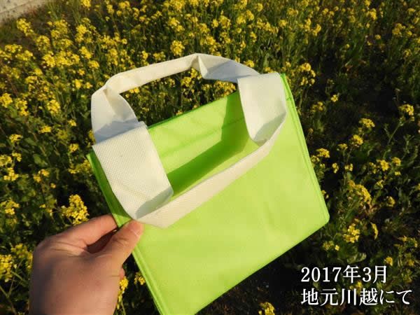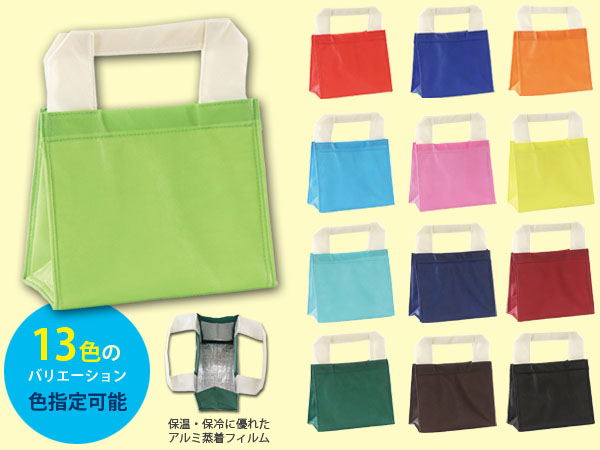 シンプルな本体に大きめのハンドルがチャーミングなデザインのランチバッグは内側が保温・保冷効果にすぐれたアルミ蒸着フィルム加工となっているので便利です。さらにポイントなのは、13種類もの豊富なカラーバリエーションがあること!しかも色指定が可能です。粗品として大量に配布する際にはぜひともディスプレイしてあげると大変見栄えがありますのでおすすめです。シンプルデザインですので名入れも視野に入れておきたいですね。