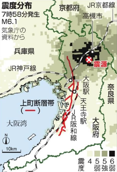 6月18日月曜日の8時に、大阪を中心とした震度6の直下型地震が発生。