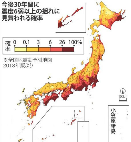 どす黒く赤い部分。26%から100%の地域の部分が、ほぼ太平洋側の日本経済中心地であり、先の大阪中心とした地震も記憶に新しい。