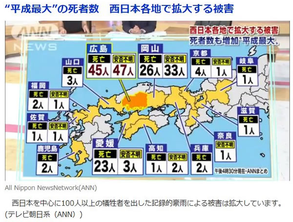 これは安否不明も含めると相当な数の死者数が今後上がるので、平成最大の豪雨被害と言っても過言ではありません。