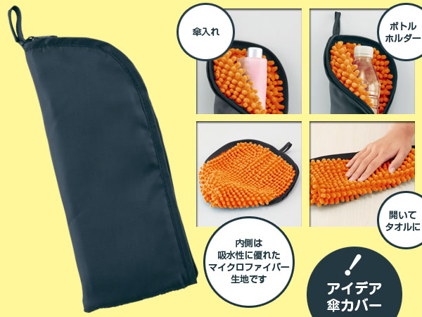 ペットボトルや濡れた折りたたみ傘を入れるのに便利な内側に吸水素材を使用したポーチ。ケースの内側には吸水性の高いマイクロファイバーの大きな束がびっしりついています。もともと掃除用アイテムとしても効果を発揮しているマイクロファイバーなので汚れも取ることができるのも利点です。ちょっと面白いアイテムのアイディアグッズなので創意工夫関連の参加賞にも使うことができます。その他には一般的にボトルケースとしても便利な雑貨としても活用することができます。