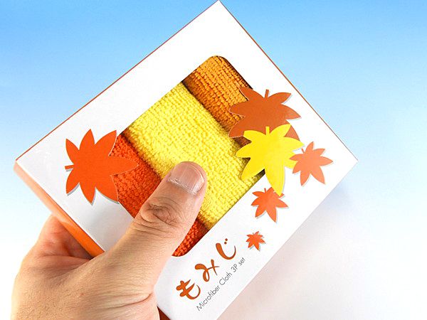 秋らしい紅葉カラーがあたたかさとやわらかさを演出するマイクロファイバークロスの3枚セットです。クロスの大きさは200×200mmとハンドタオルなどと同じ程度で取り回しが良いのが魅力。マイクロファイバーはほこりを吸着しやすい性質なのでお掃除クロスとして活躍します。またパッケージの化粧箱もおしゃれなデザインとなっていますので秋のシーズンの各種イベントや催し物での来場記念品として喜ばれるクオリティです。