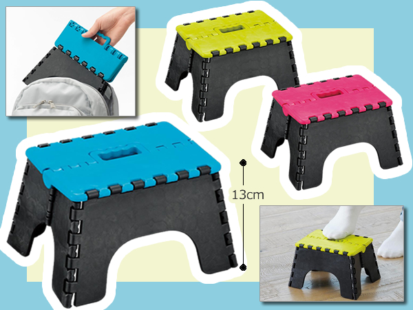 平らに折りたためるので携帯にも周王にも便利な踏み台です。ホームセンターなどでも沢山販売されているのでおなじみになっていますがネット通販の方が同等商品で低価格です。サイズは高さ13cmととてもコンパクトなものです。料理などで使ったりするのではなく、ちょっと背の届かないところのものを取るときなどに便利です。また子供用の折り畳み椅子として使えるのも大きなポイントです。歩いていて疲れた子供の休憩に便利な思いやりグッズでもあります。