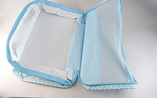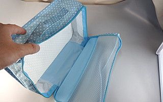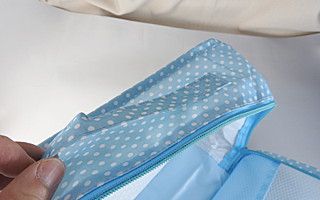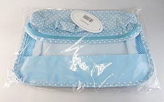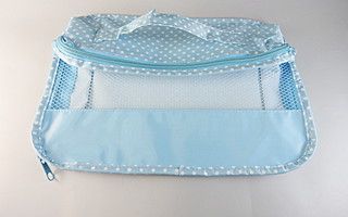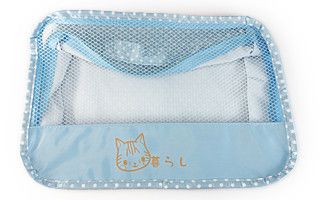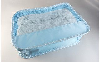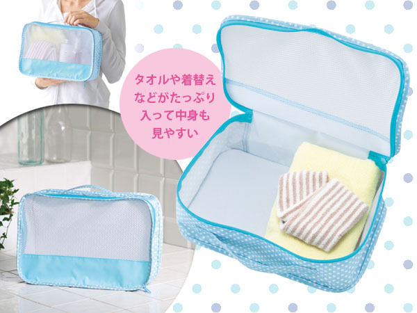 表面部分がメッシュになっているミニバッグ。通気性が良いのでこちらも横メッシュと合わせて水濡れや乾燥に関したシーンで使いやすいバッグ。バッグ下部分の布の場所にロゴなどを高さ約2cmほどのサイズでプリントすることが可能です。中身が見えるのでバッグインバッグやトランクの中の整理などに便利です。