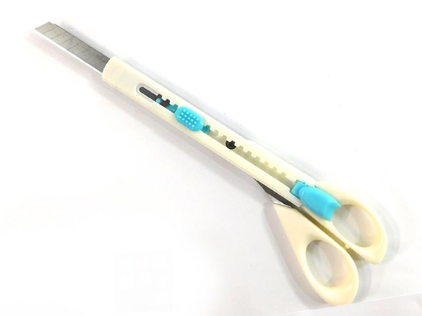 売っていそうで売っていない!いかにもノベルティという感じのもらいたくなる文具です。ハサミの即片がカッターになっている面白い仕様です。