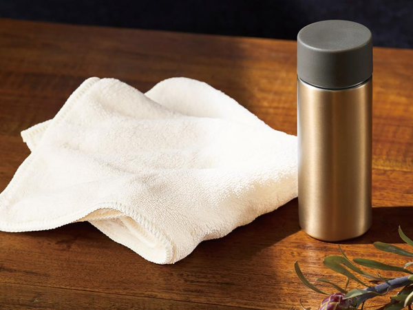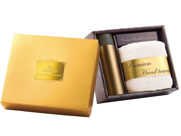 見た目のよいゴールドのパッケージ箱に入ったマグボトルとハンドタオルのセットです。ハンドタオルは特に手触りの良い普通のタオルです。よくあるハンドタオルは20cmですが、こちらは約30cmなのでちょっと大き目がうれしい実用的サイズです。