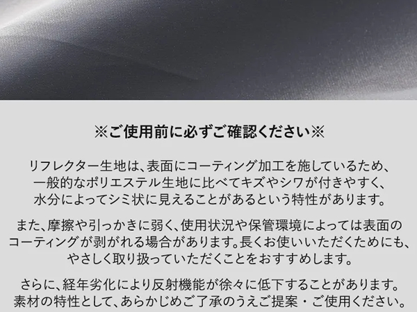 | 材質 | ポリエステル(リフレクターコーティング)、亜鉛合金 他 |