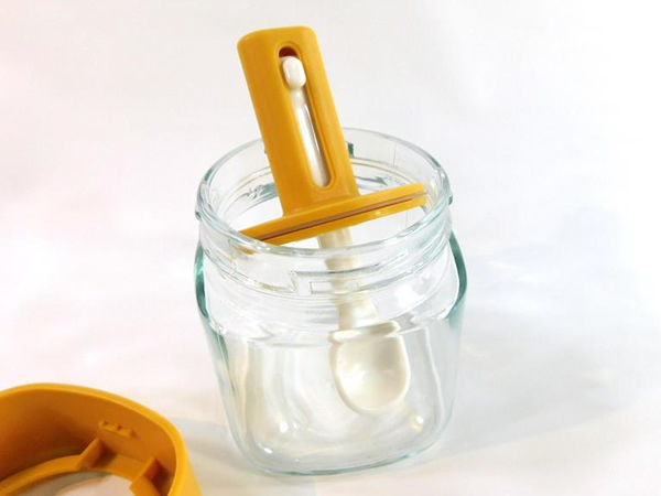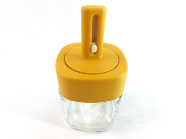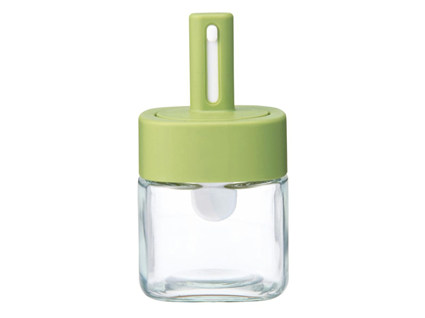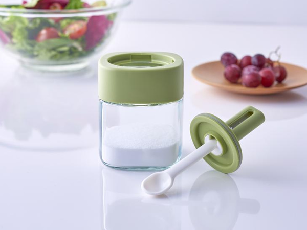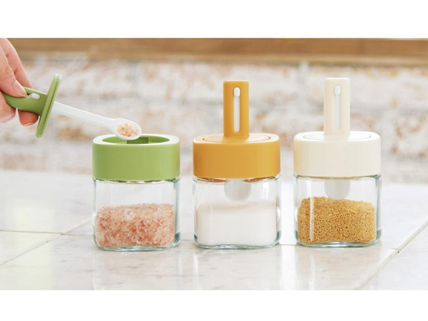 ガラス製の調味料ケースです。フタ部分は中身の量に応じで伸縮するスプーンになっているので使うときに便利です。見た目がかわいいのと実用的なデザインなのでちょっとポイント高いキッチンアイテムです。スプーンは約1gなので計量目安にも便利です。