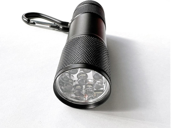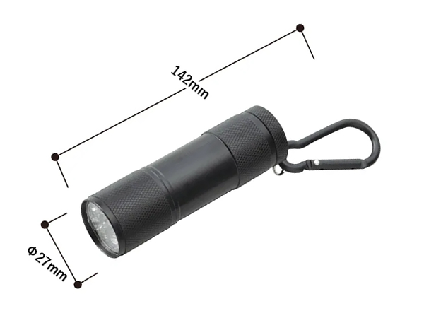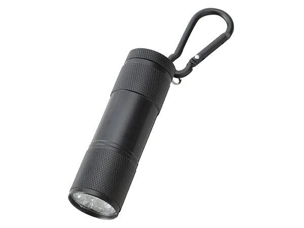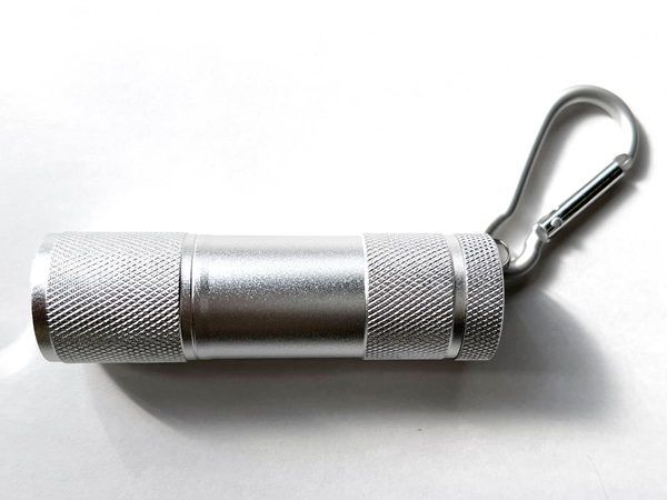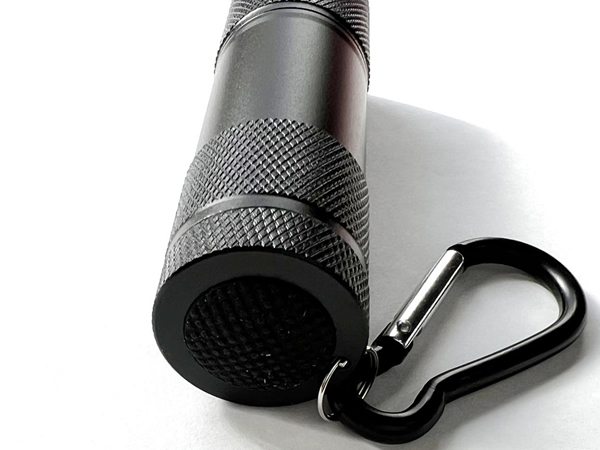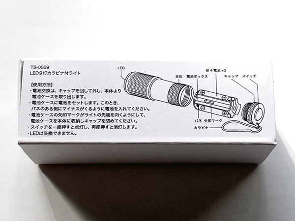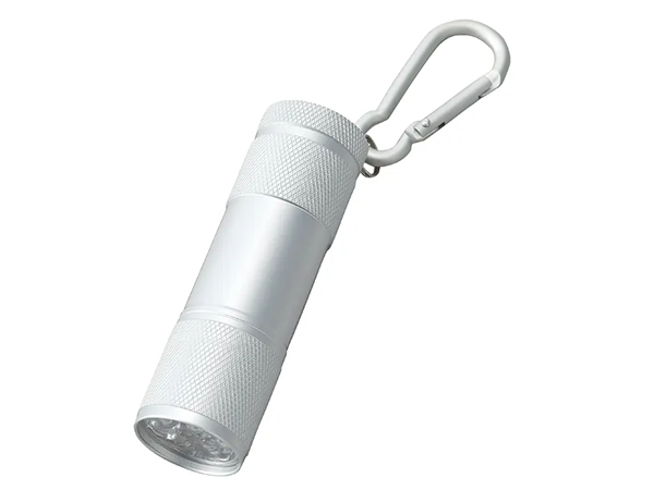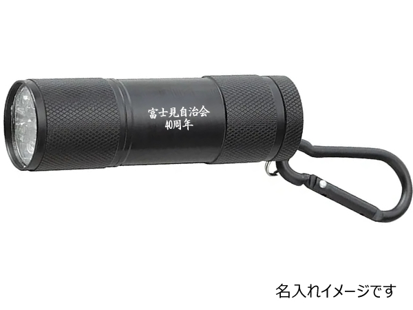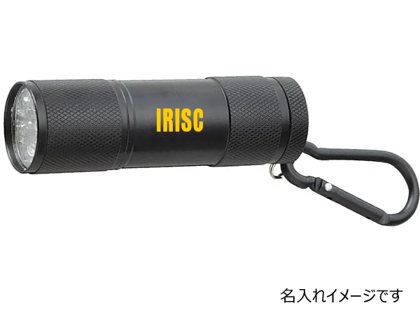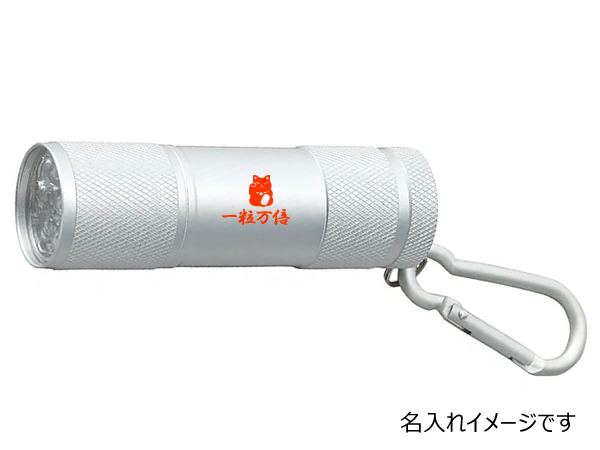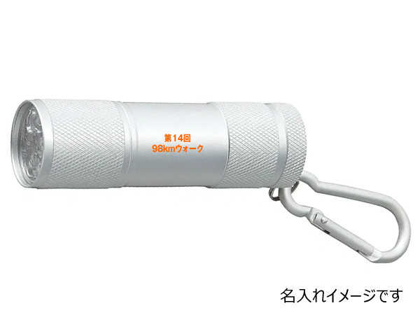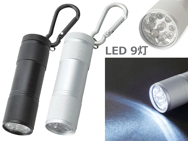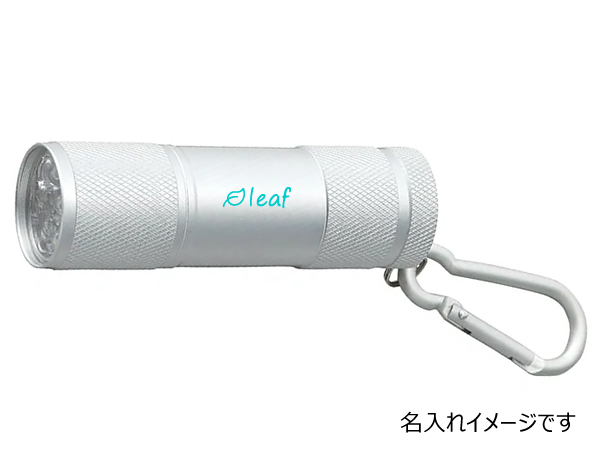 カラビナ付きのLEDライトです。アクセサリーにしたり自転車やバッグなどにひっかけて使用できます。LEDライトは最近の傾向としてはCOBライトに転換されてきているので従来の9灯タイプは珍しいスタイルです。名入れ対応なのでちょっとした実用的な記念品としておすすめです。電池タイプは単4×3本です。商品には添付していないので別途購入でお願いします。