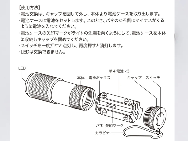| 備考 | 単4乾電池3本(別売)、取説付(紙箱面) ※商品に電池は含まれません。 |