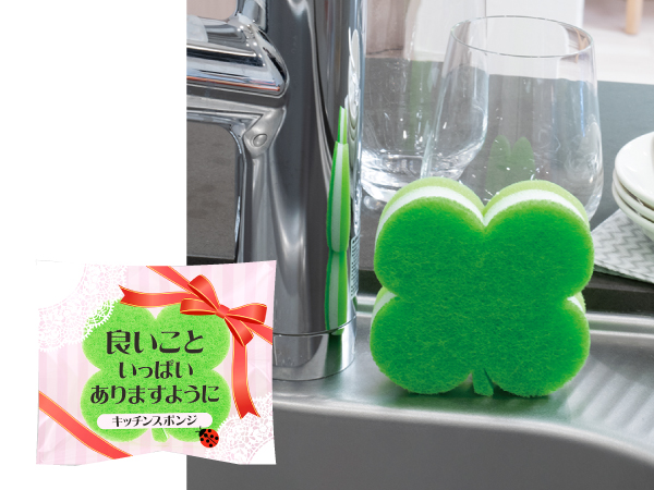 幸せを呼ぶ四つ葉のクローバーがモチーフのキッチンスポンジ。