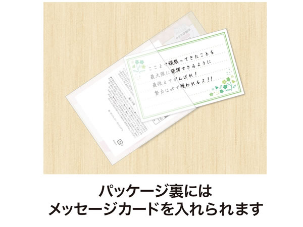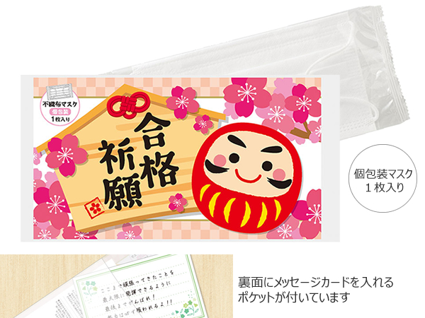 個包装のマスクが1枚入っています。パッケージが合格祈願なのでもらって元気のでそうなアイテムです。パッケージ裏面にはポケットが付いているのでメッセージカードなどを添えて渡すことができます。