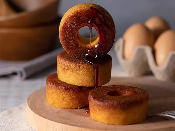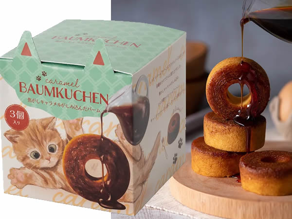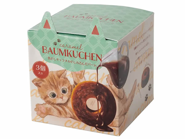 焦がしキャラメル香るバームクーヘンの猫パッケージ。しっとりバームクーヘンにカラメルソースをまとわせ、砂糖をかけてさらに焼き上げました。焦がしキャラメルがしみ込む、ひと手間かけたバームクーヘン。ゆっくりマイペースに過ごしたいネコ日和なときに。