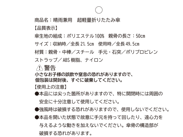 | 材質 | 生地/ポリエステル 親骨・中棒/スチール 手元・石突/ポリプロピレン ストラップ/ABS樹脂、ナイロン |
