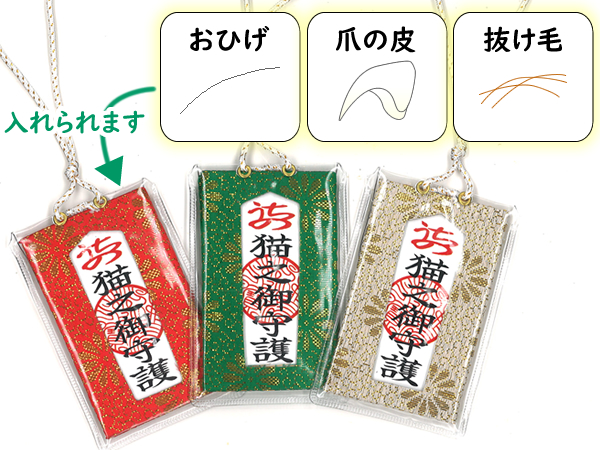 猫のひげ、爪とぎをしたあとの爪の皮(抜け殻)、抜け毛、乳歯、抜けちゃった刃などを入れて身に着けたいお守り袋です。いつも愛猫がそばにいてくれるような気持の安らぎになるアイテムです。お家でお留守番している猫様や虹の橋を渡ったあの子がそばにいて、きっと守ってくれています。