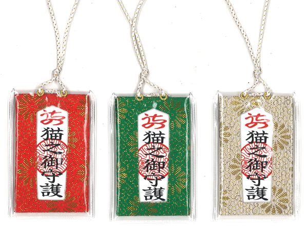 お守りの模様は上面に「うちの」、真ん中の印鑑は三宝印、中央に「猫之御守護」と書いてあります。