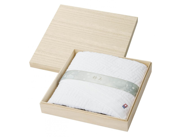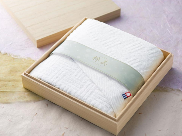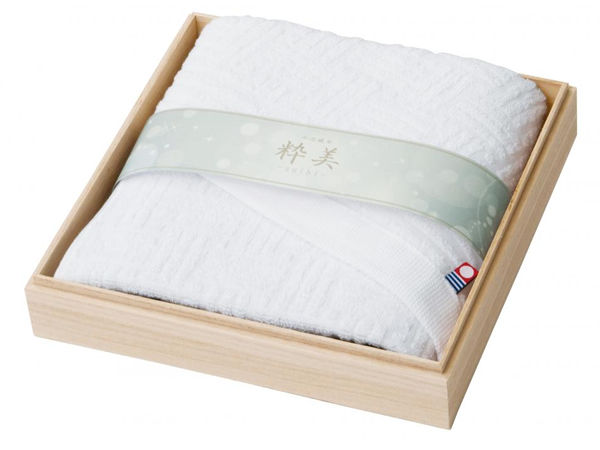 贈答品として高級感のある木箱に入った今治フェイスたおる「粋美(すいび)」とは、混じりけがなく美しいさまを表しています。綿本来の美しい白さとやわからさ、吸水性を引き出します。安心の今治タオル。