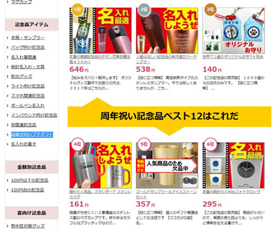 例えば、人気の「周年祝いカテゴリー」をご覧頂ければわかりますが、このようにカテゴリーごとでも人気品商品が一目でわかるようになっております