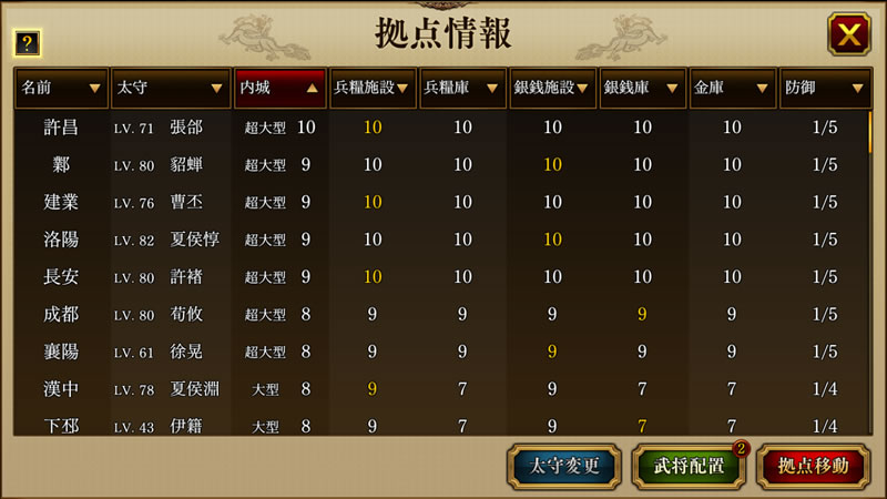 ただし、無作為に対応すると時間の無駄なので、施設である「兵糧施設」と「銀銭施設」を投資。都市レベルは高い順から対応し、お金が貯まれば、プレイしない時間は都市へ投資してリターンを得るようにしましょう。