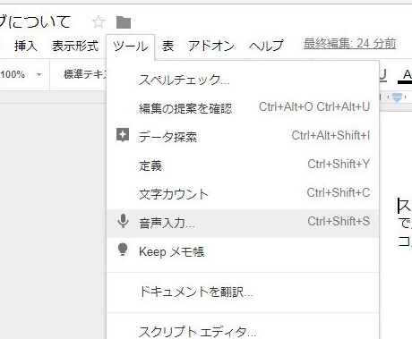 次に、「ツール」「音声入力」と設定し、あとは、マイクのマークが出ますので、しゃべるだけです。簡単すぎて説明しずらいです。