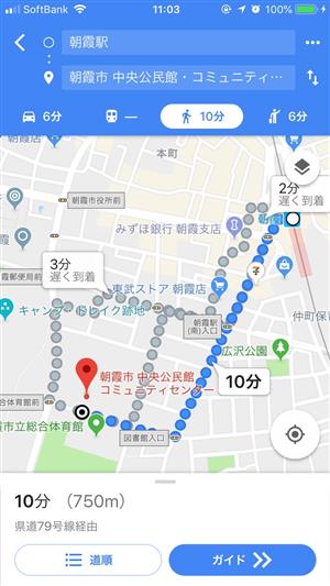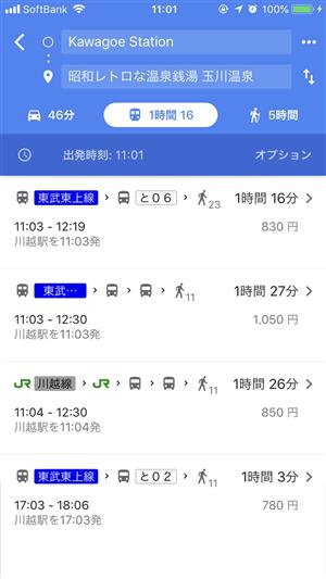 電車なら乗換案内や時間も出ますし、徒歩なら距離や時間も出ます。