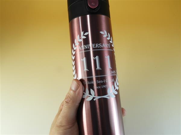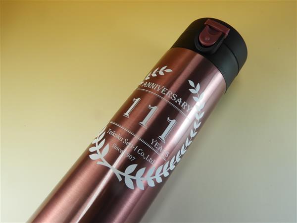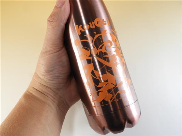 回転印刷の事例ですが、今回は、そのデザインも良いのですが、本体黒に対応して、名入れ印刷の色が「明るい緑」に、綺麗に印刷されて、世界で1個の貴重なマイボトルになっている点が素晴らしいです。