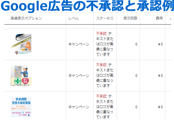 新しく機能が増えた「Google広告の画像」ですが、いろいろUpしてもすぐに「不承認: テキストまたはロゴが画像に重なっています」となるので、ダメだったもののリストを表示します。