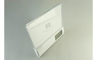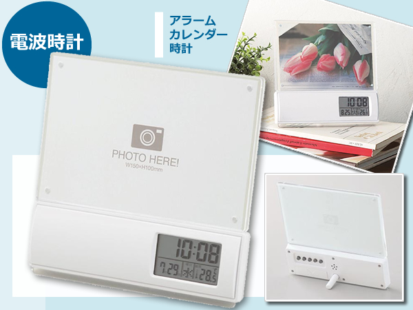 写真立てがメインのデザインで写真の下に液晶の多機能時計がついています。機能は自動で時間調節ができる電波時計、アラーム、カレンダーで、これ一つあれば置時計の役割も目覚ましにも使えるので新生活の応援にも便利に使うことができます。写真にあらかじめ学校名やサークル名をプリントしたものを準備して、はさんでプレゼントすれば名入れ代の予算を浮かすことができます。液晶左部分の白いスペースに学校名や会社名を名入れすることも可能です。