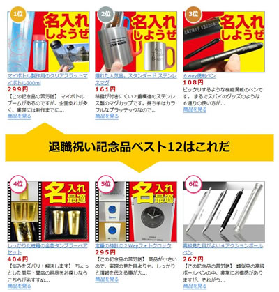 人気といっても、楽天のような売り上げ順やお客様の声順ではなく、あくまでもアクセス順として表示しております。ですから精度としては、「非常に公平」でありまして、ベスト12は単純に皆が見た人気の退職記念品となります。