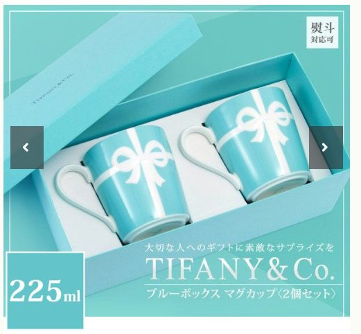 卒業記念品で、大きな私立女子大学や、大きな私立女子高校で、たまにみかけるティファニーのリボンマグカップ。